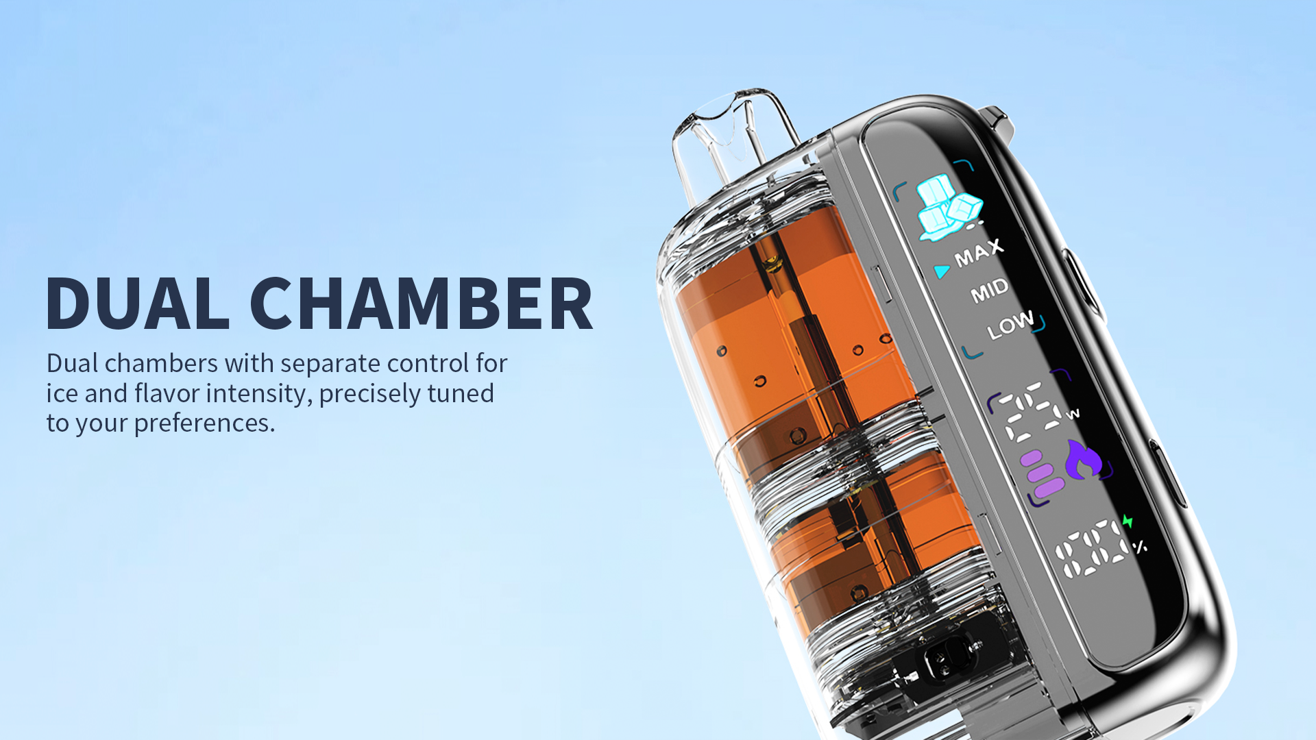 Experience independent control of ice and flavor with a dual-chamber system. Fine-tune every inhale exactly how you like it—cool and mild, warm and bold, or anywhere in between.
